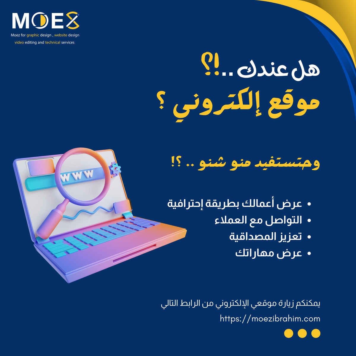مصمم ويب مبدع لدي خبرة واسعة في تصميم المواقع الديناميكية والجذابة ، ملم بأحدث تقنيات تصميم الويب